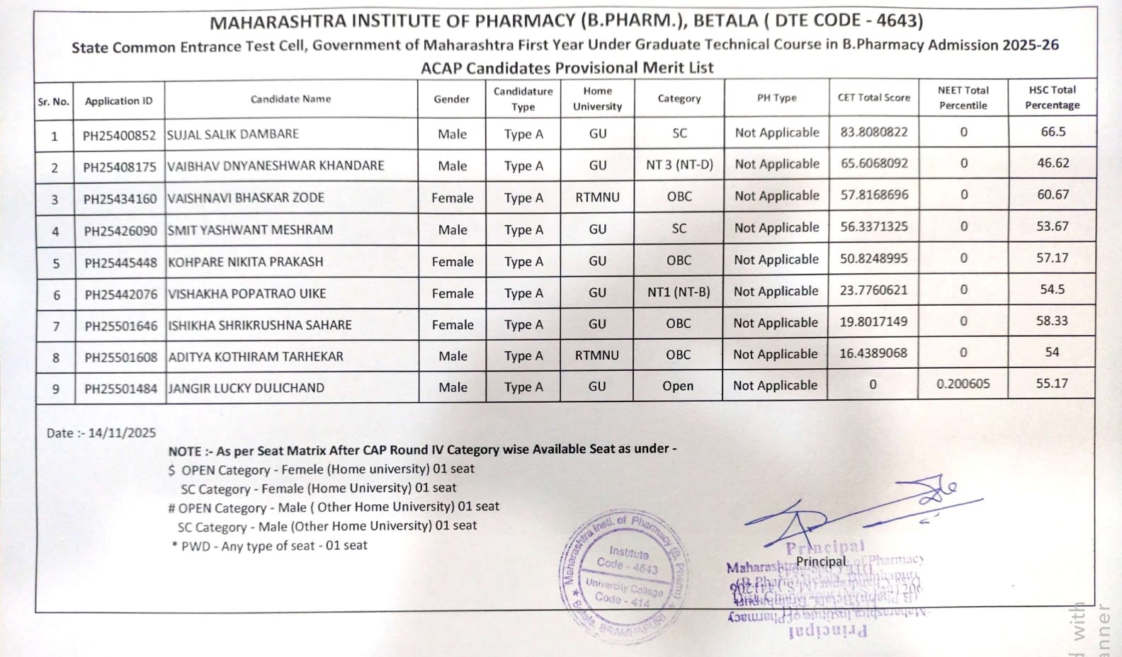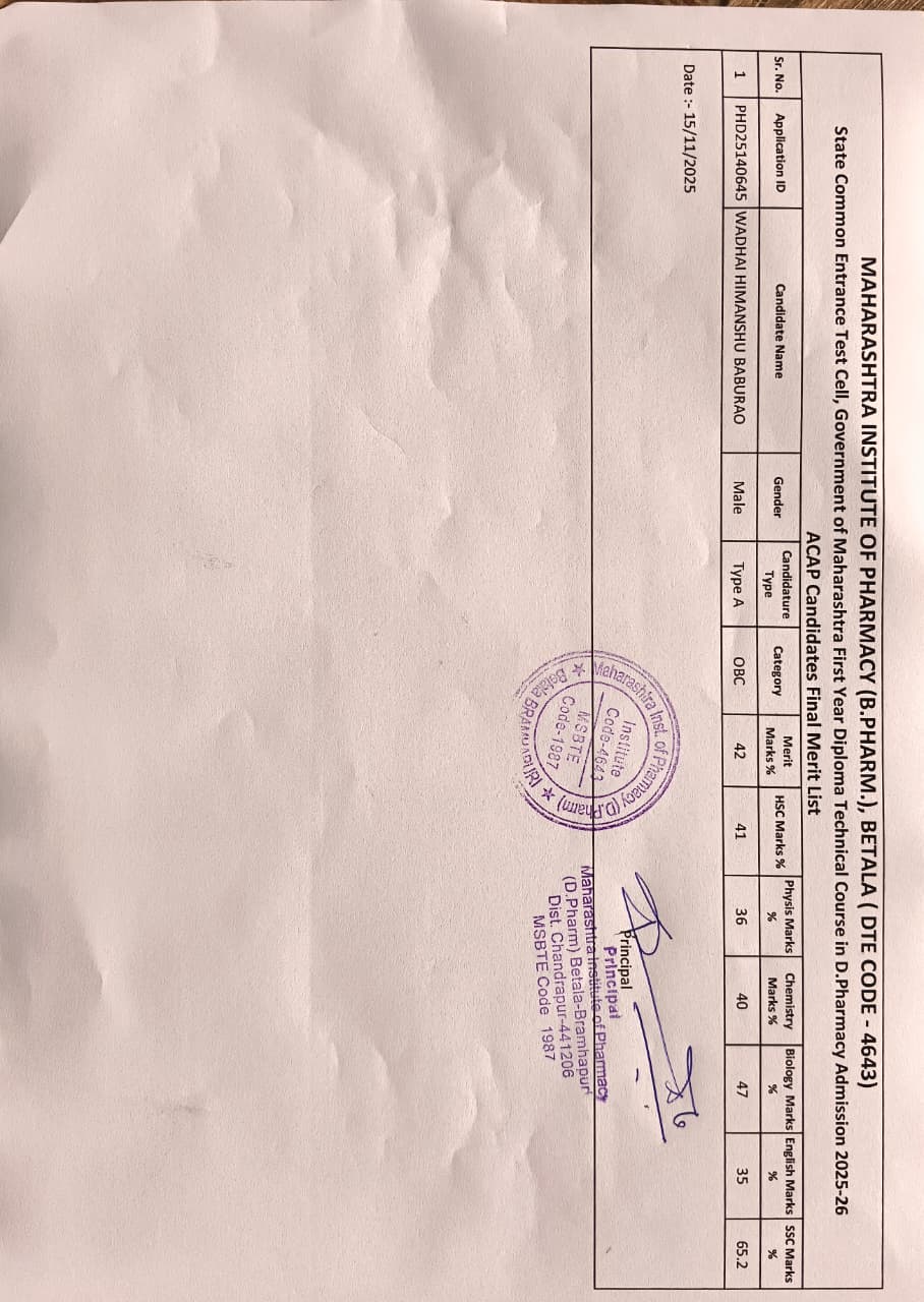 • B.PHARMACY ACAP FINAL MERIT LIST 2025-26 Click Here
