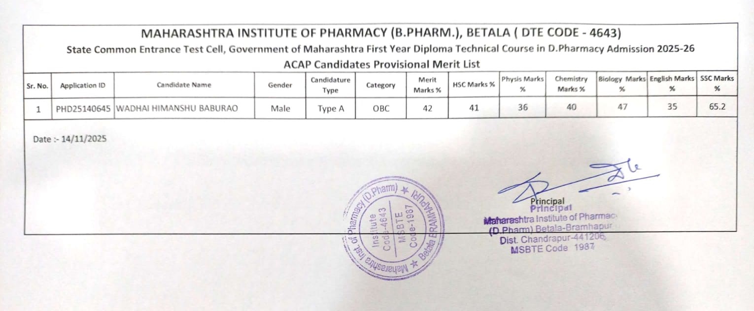 • D.PHARMACY ACAP PROVISIONAL MERIT LIST 2025-26 Click Here
