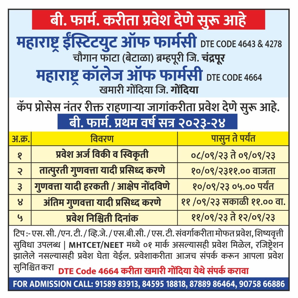 It gives me immense pleasure to introduce Maharashtra Institute of Pharmacy (B.Pharm), Chughan Phata, Armori Road Betala Bramhapuri. Maharashtra Institute of Pharmacy (B.Pharm) offers a 4-year academic course in Bachelor of Pharmacy.